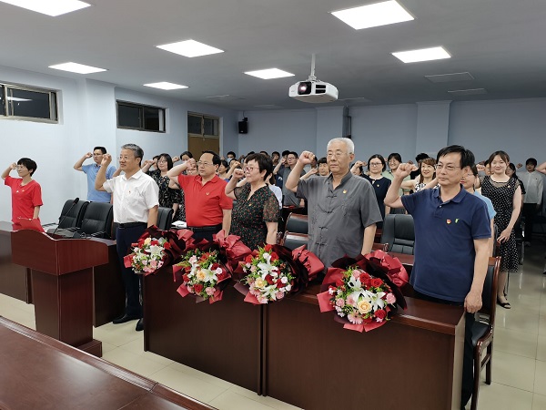 活动首先由学生党员为我们光荣在党30年的老党员李相国、孙孟奎、陈敏、王保中同志献花。周鑫同志带领全体教师一起回顾了四位老党员为申慱sunbet娱乐发展所取得的成绩,并送上对四位老党员的祝福。随后全体党员同志佩戴党徽,面向鲜艳的党旗,在周鑫同志的带领下,大家列队整齐,举起右手,在党旗下庄严宣誓。许多党员顿时热泪盈眶,激动不已,同志们高亢而又洪亮的声音在会议室久久回荡。