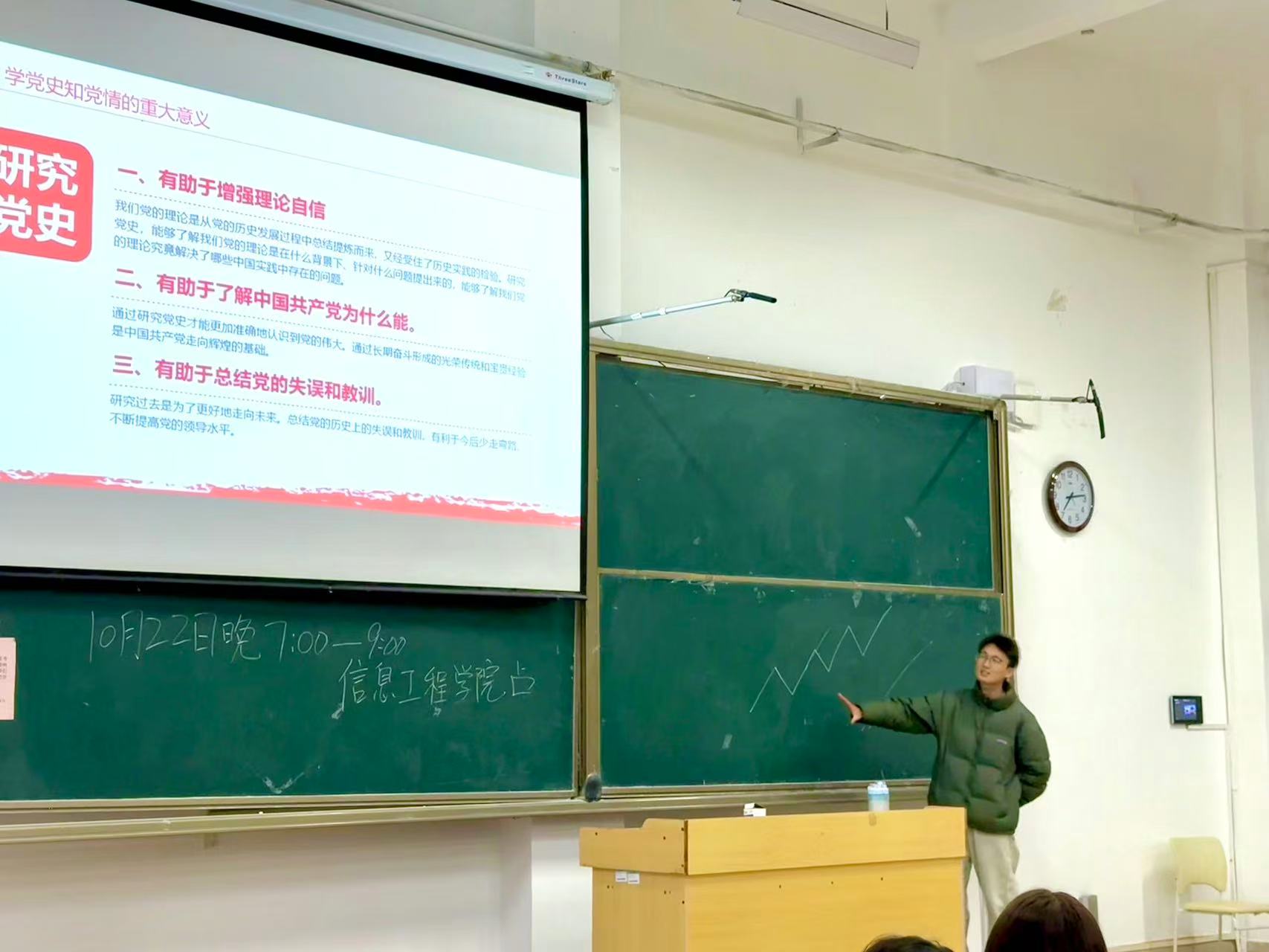 10月22日,辅导员马江凯就党的基本理论、路线、纲领及四史教育作专题讲座。他深入阐释了“党领导团、团紧跟党”的密切关系,引导学员们以史为鉴,明辨是非,汲取前行力量。